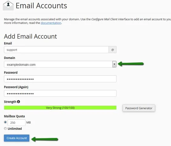Fill Email: with the name of the account you want to create, now If you are using multiple domain, just select the domain name you want to create a email at with clicking on the dropdown list. Fill Password: section with desired password for the email account than re-type the password. Please be sure you do correctly enter the password in both field. Now chose mail quota, you can specify email quota by filling the section with desired number or just select the unlimited button to give un-metered space.
